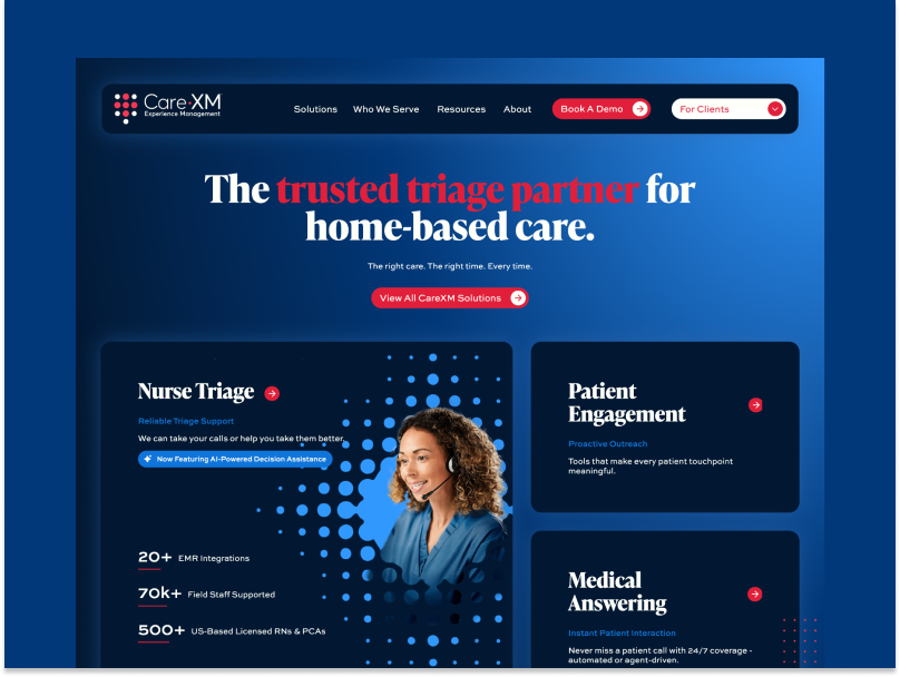 Communicate Complex Offerings & Technology: CareXM is best known for their customizable and powerful nurse triage solutions that include both staffing solutions and software. Communicating the nuance of those offerings without overwhelming the user is a tricky balancing act.