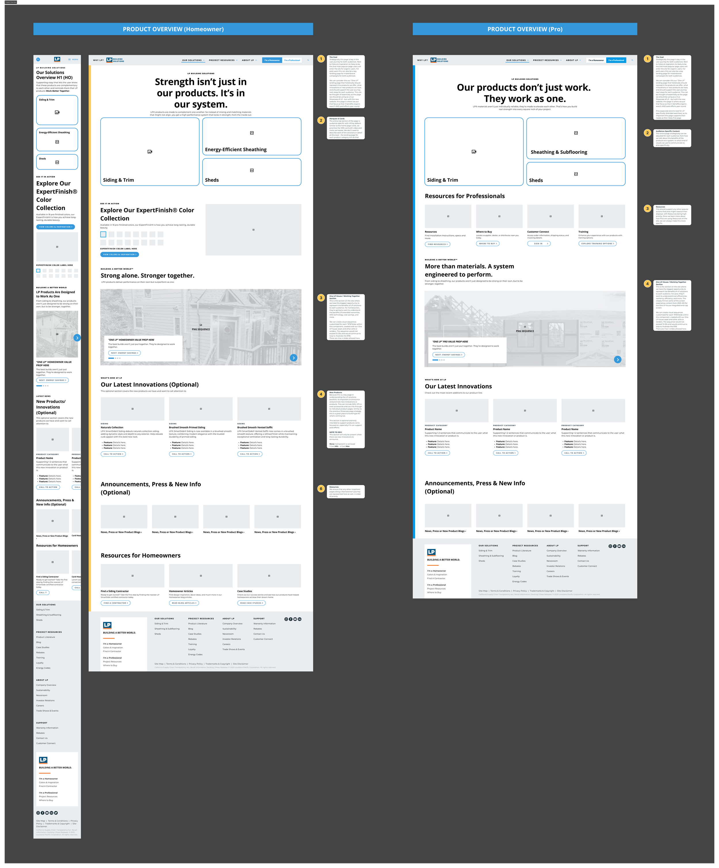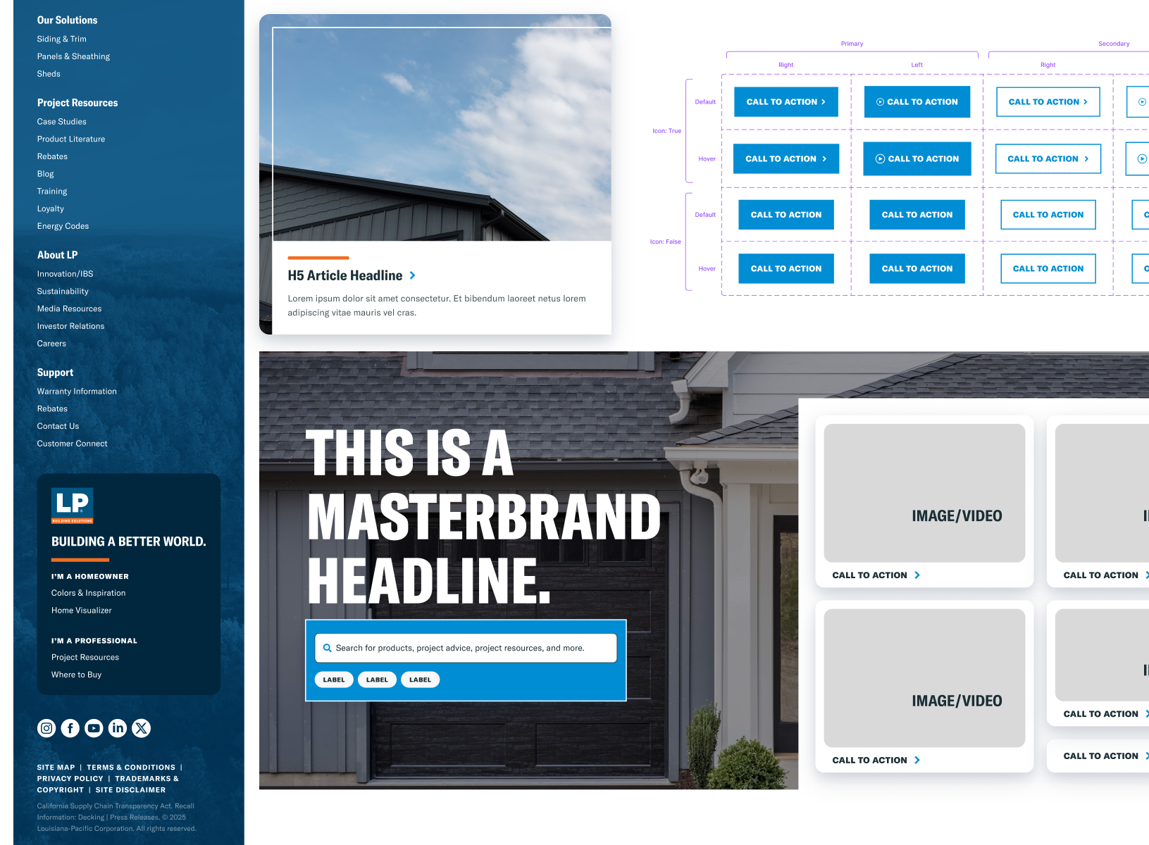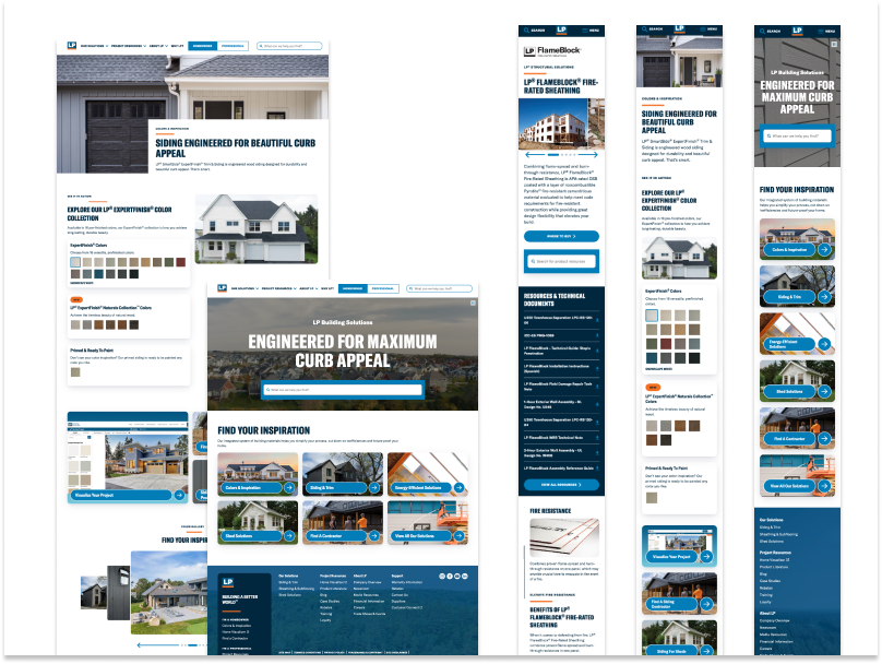 LP came to us wanting an enterprise website redesign in order to better meet the needs of multiple audiences, improve the discoverability of their platform and drive leads. Their builder audience had a hard time finding the documents and installation info they needed, while homeowners struggled to understand the next steps needed to reside their home with LP. We set out to create a singular platform that could keep up with LP’s need to deliver dynamic, personalized content to the right user at the right time.